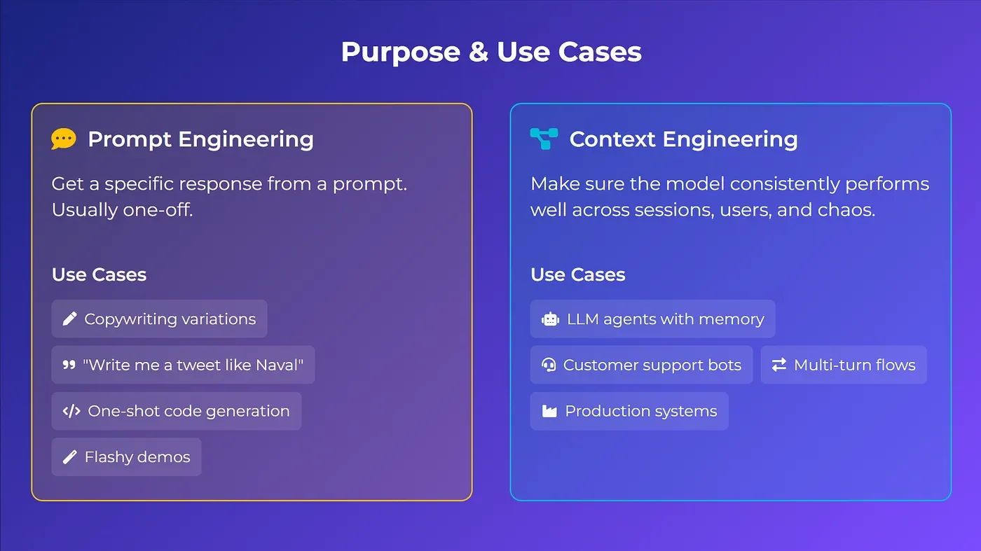 Prompt engineering gets you the first good output. Context engineering makes sure the 1000th output is still good.